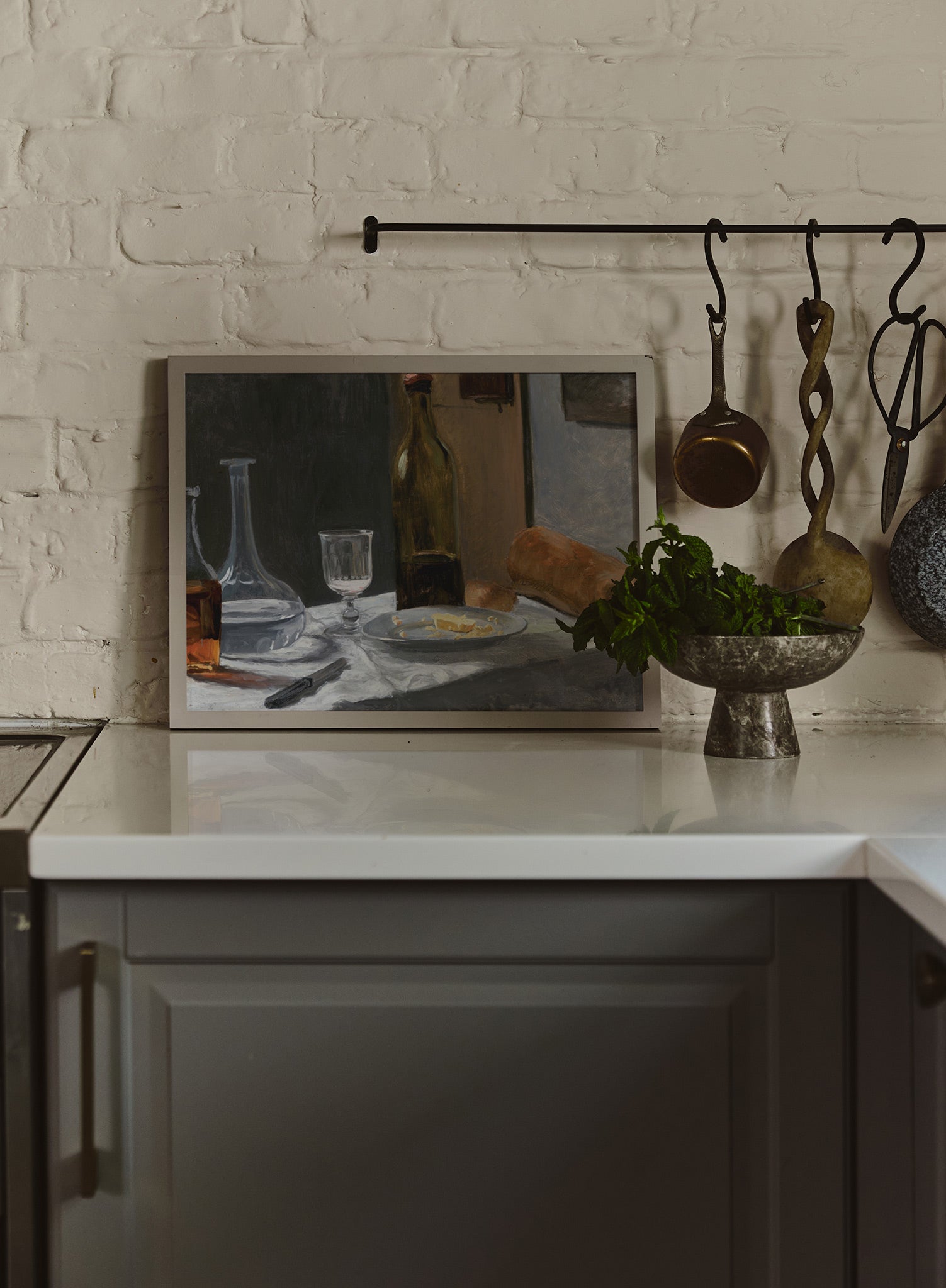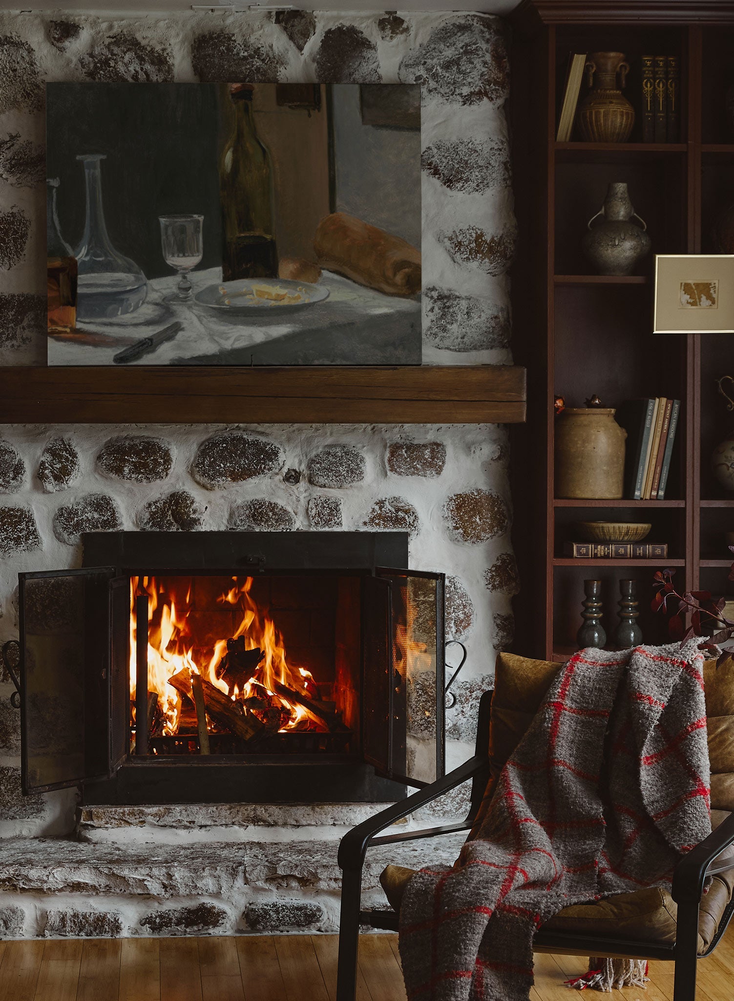 A partially consumed loaf of bread and a plate with crumbs suggest that a meal has just ended, giving the painting a lived-in, narrative quality. A bottle of wine, along with a glass and carafe, catch the light subtly, highlighting the transparency of the glass and the rich amber hue of the wine.