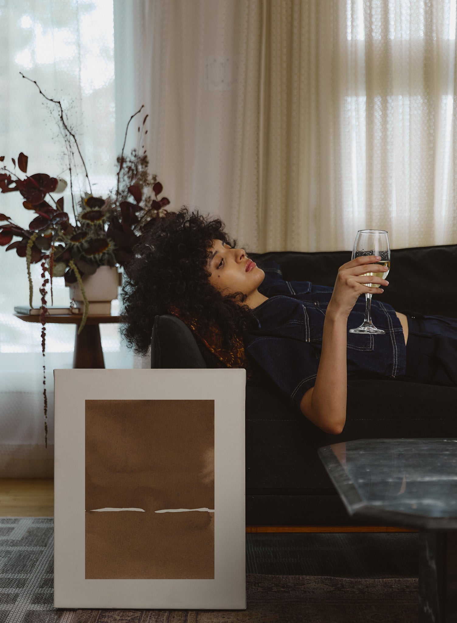 The background is a soft, neutral cream color, which contrasts with the boldness of the central shape. The simplicity of the composition is striking, as the artist uses very few elements to create a sense of balance and calm.