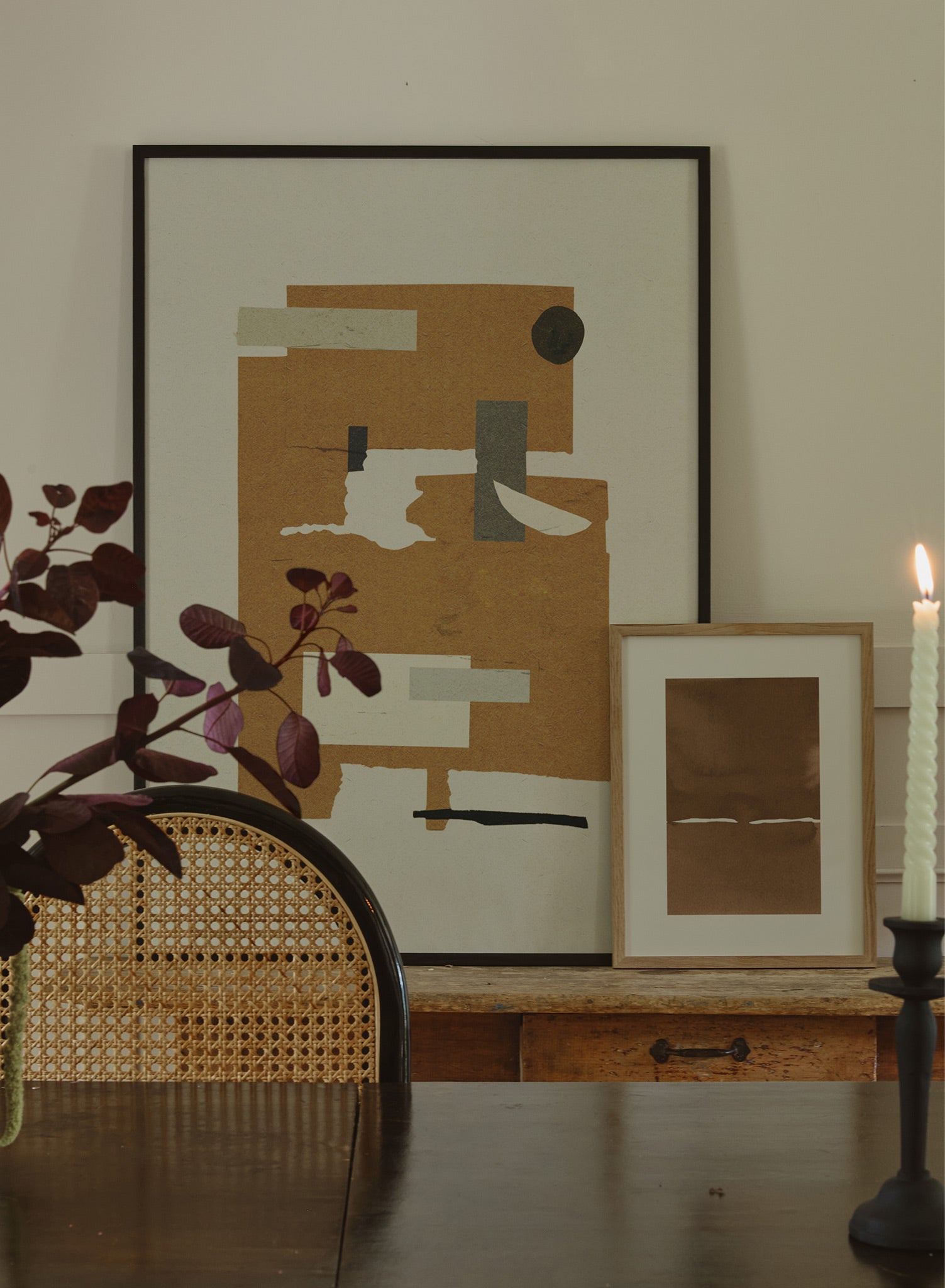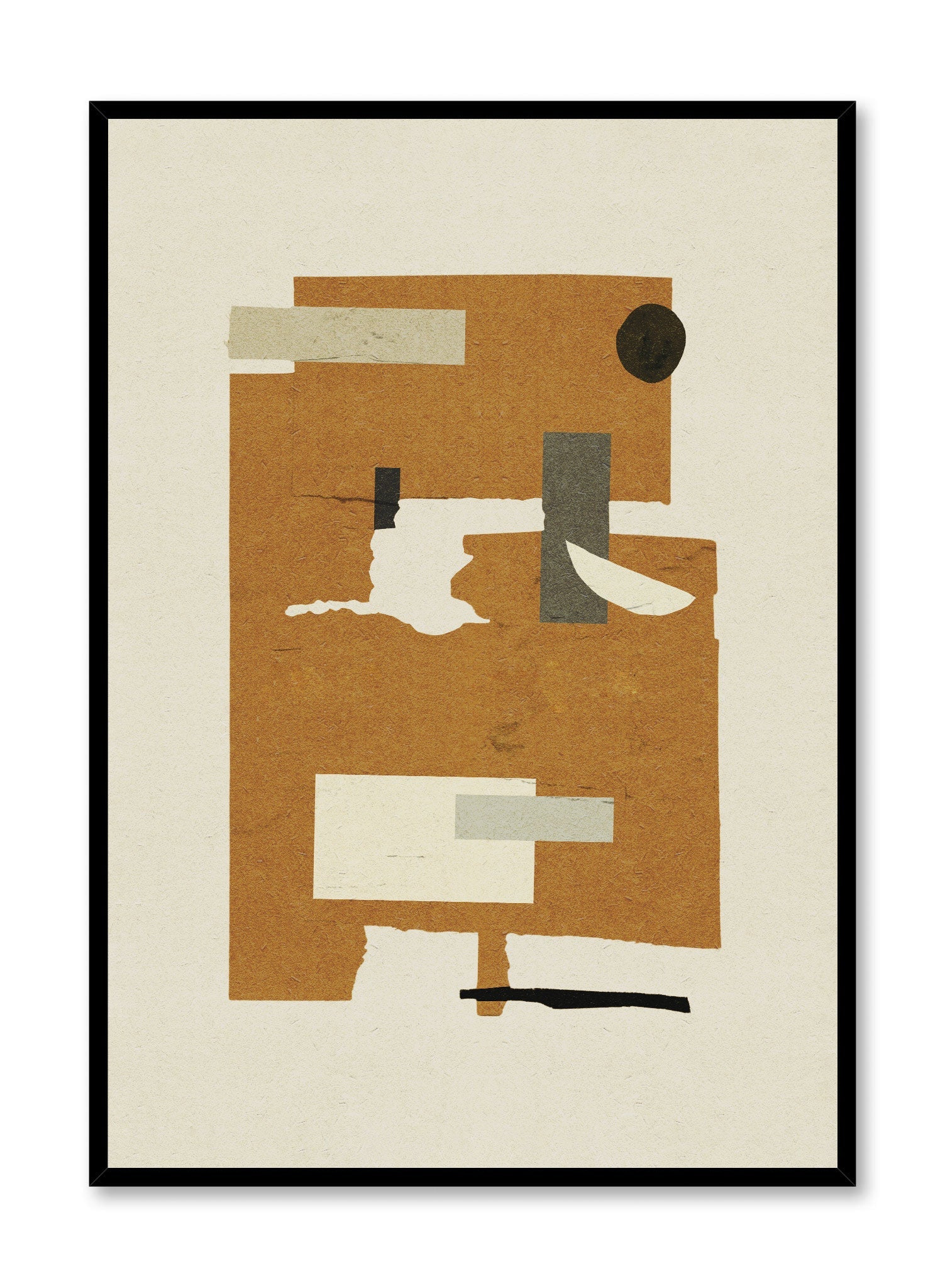 This abstract, collage-style artwork plays with geometric forms and earthy tones. Rectangles and irregular shapes overlap and interact on a pale cream background, creating a sense of movement and layering.