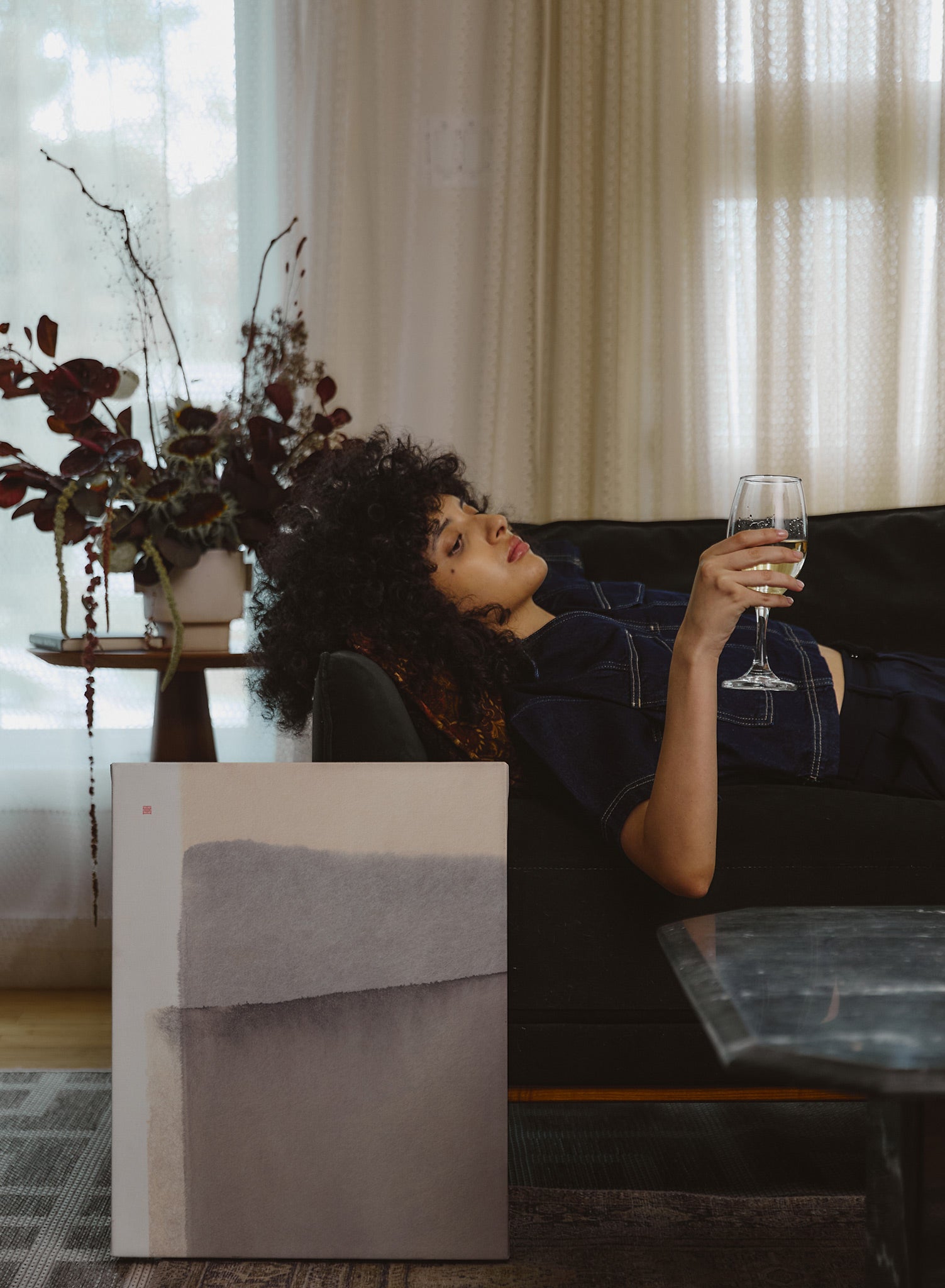The minimalism of the piece is enhanced by a small, red square seal in the upper left, which adds a touch of tradition, reminiscent of Eastern or Zen aesthetics. The texture of the brushstrokes creates a calming, almost meditative feeling, as if you're looking at a landscape that exists in the realms of both the physical and the spiritual.