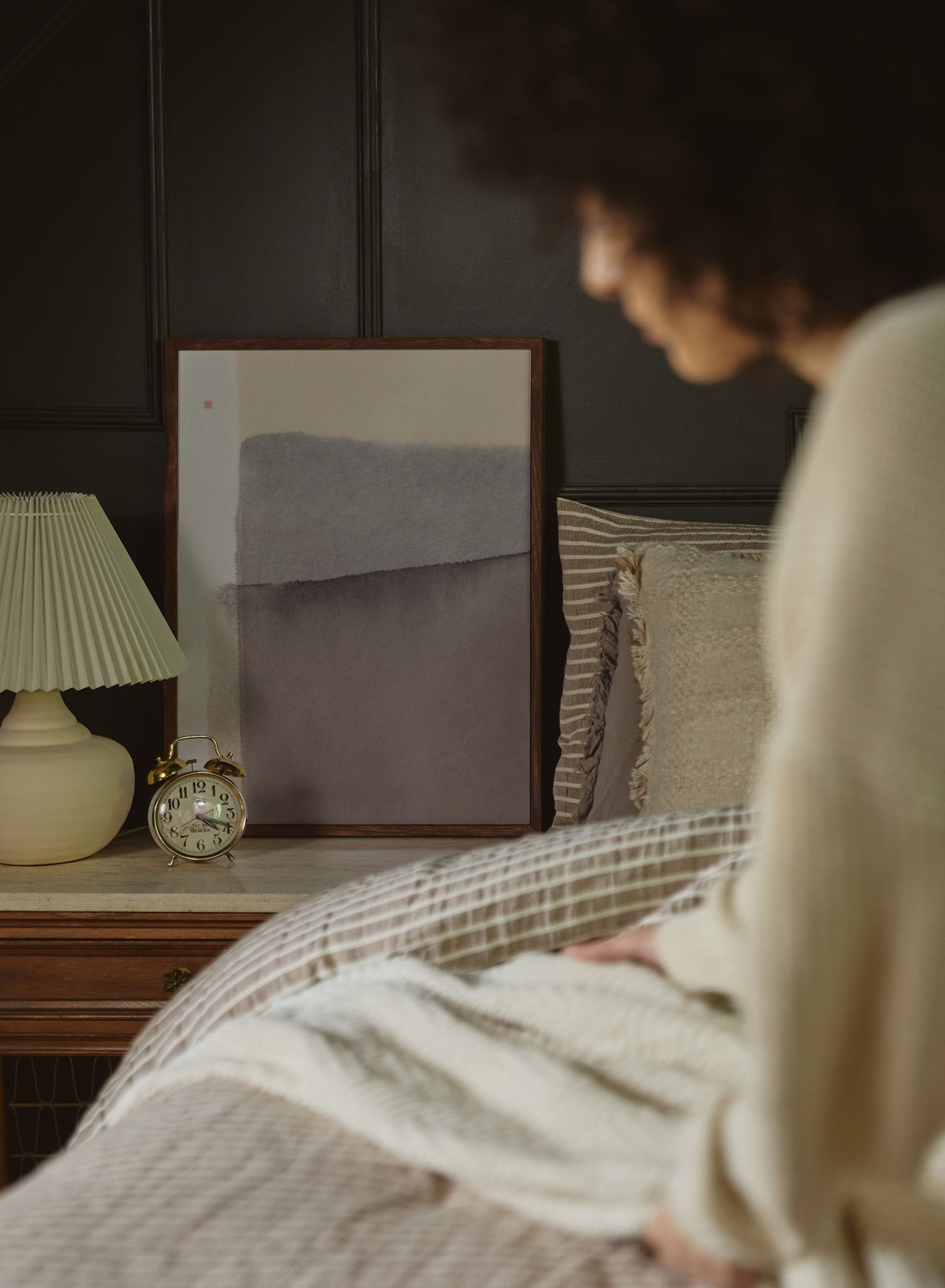 The top portion of the artwork is dominated by a warm beige tone, transitioning into a softer gray as your eye moves downward. There's an intentional use of light and shadow within the layers, creating a sense of depth despite the overall flatness of the composition.